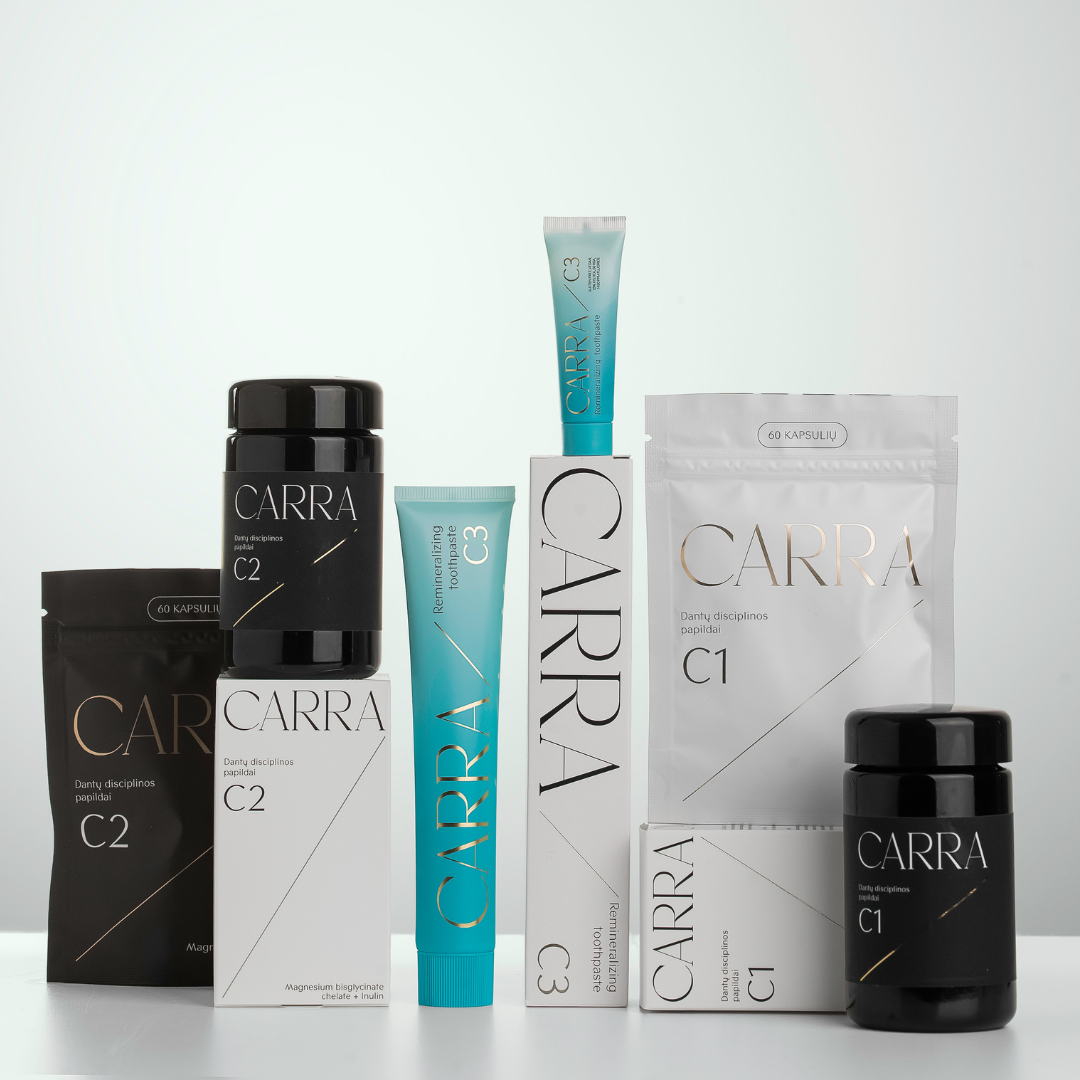 Čia rasite ir CARRA – dantų disciplinos liniją, kurią kūriau su meile savo pacientams ir bendruomenei. Lauksiu jūsų užsukant, nes graži šypsena prasideda nuo mažų, bet teisingų įpročių”.