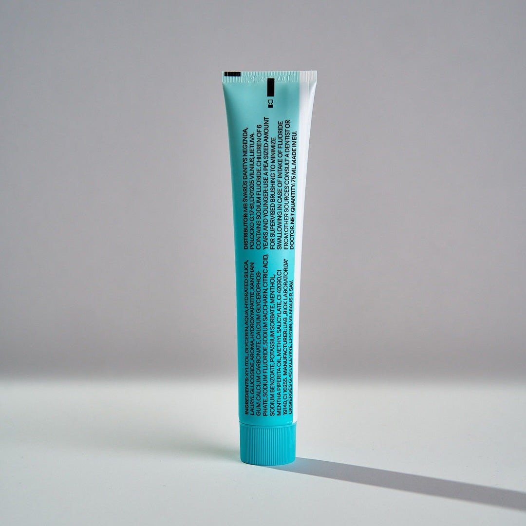 Sudėtis:Ksilitolis, glicerinas, vanduo, hidratuotas silicio dioksidas, laurilo gliukozidas, aromatas, hidroksiapatitas, ksantano derva, kalcio karbonatas, kalcio glicerofosfatas, natrio fluoridas, natrio sacharinas, natrio benzoatas, kalio sorbatas, mentolis, menta piperita aliejus, CI 42090, CI 19140, CI 16255.