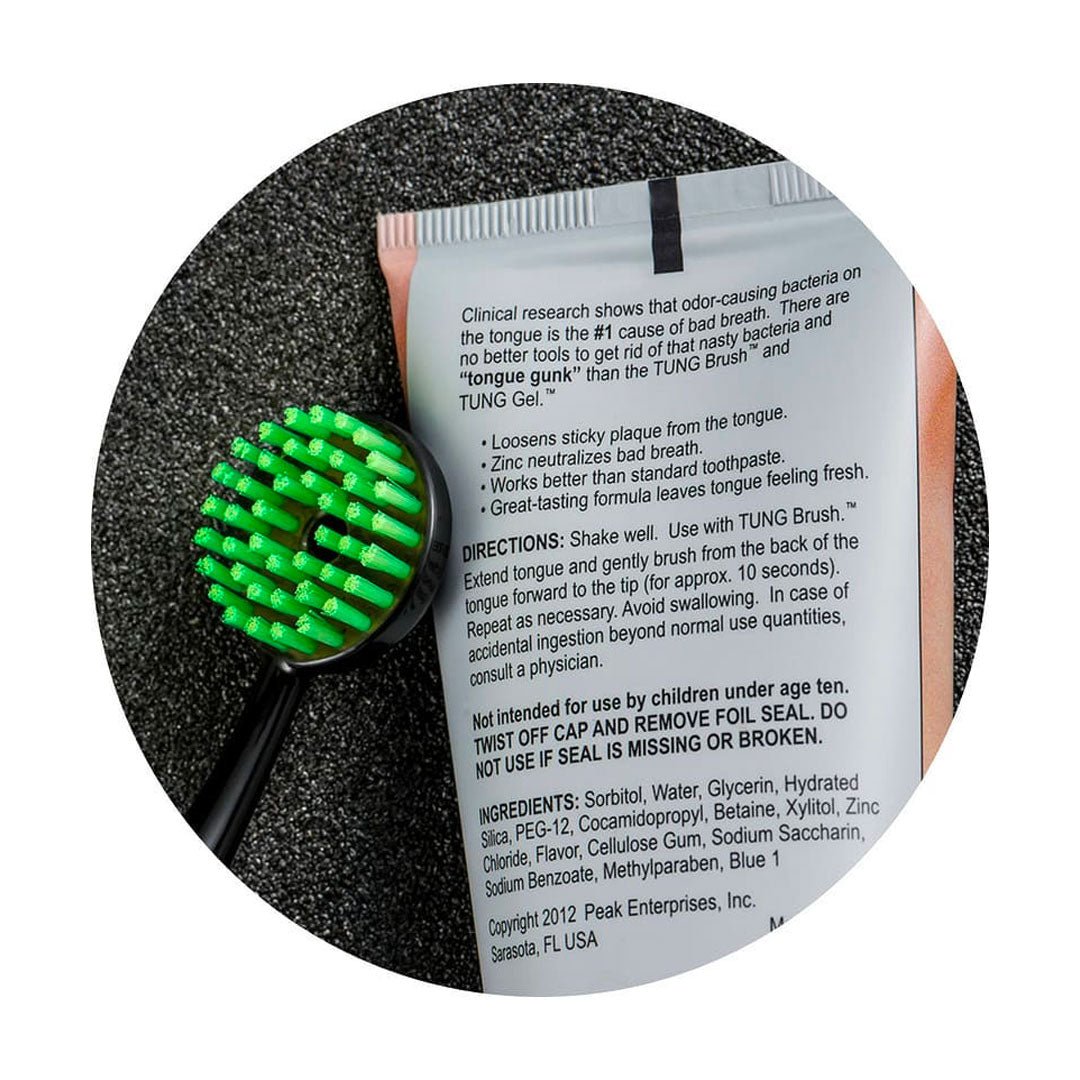 Ant TUNG šepetėlio naudokite žemės riešuto dydžio TUNG GEL kiekį. Švelniai braukite pirmyn ir atgal, bandykite pasiekti kiek galima daugiau liežuvio. Nuplaukite ir mėgaukitės gaiviu kvapu.