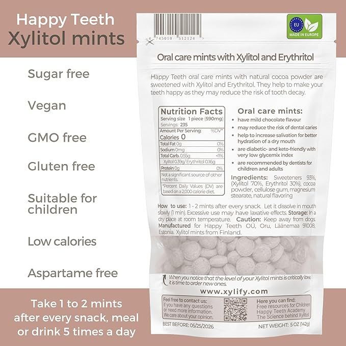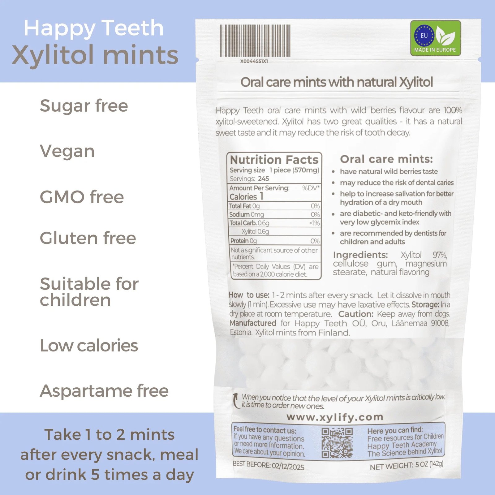 Happy Teeth Ksilitolio pastilės yra 100% pasaldintos ksilitoliu. 142 g., 235 – 265 pastilės.